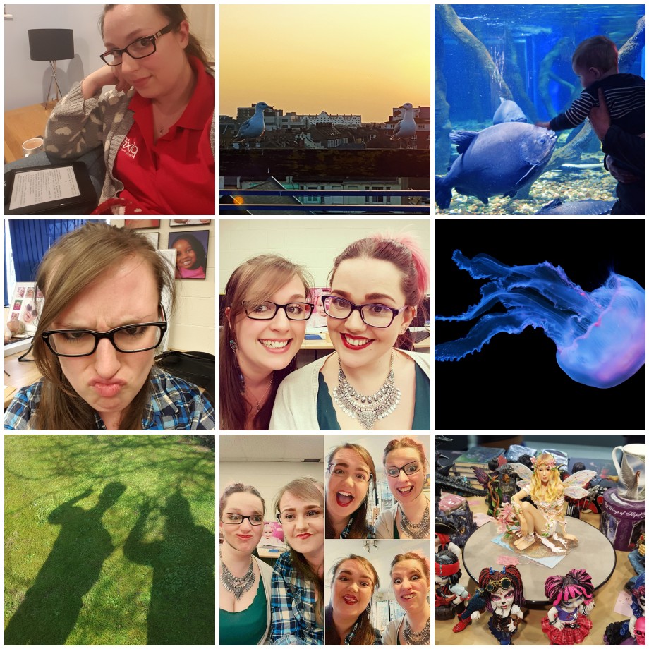 From left to right: spending my evenings with my book, seagulls watching the sunset in Worthing, a lovely trip to Bournemouth Oceanarium with Rich, Sarah and Ruben, my “grumpy face” for a work scavenger hunt, me and the lovely Rae, jellyfish…yuck!, waving shadows in Northampton, jumping on the Face Swap band wagon, and finding a Nemesis Now fairy seller in Fareham shopping centre made me instantly think of Kirsty!