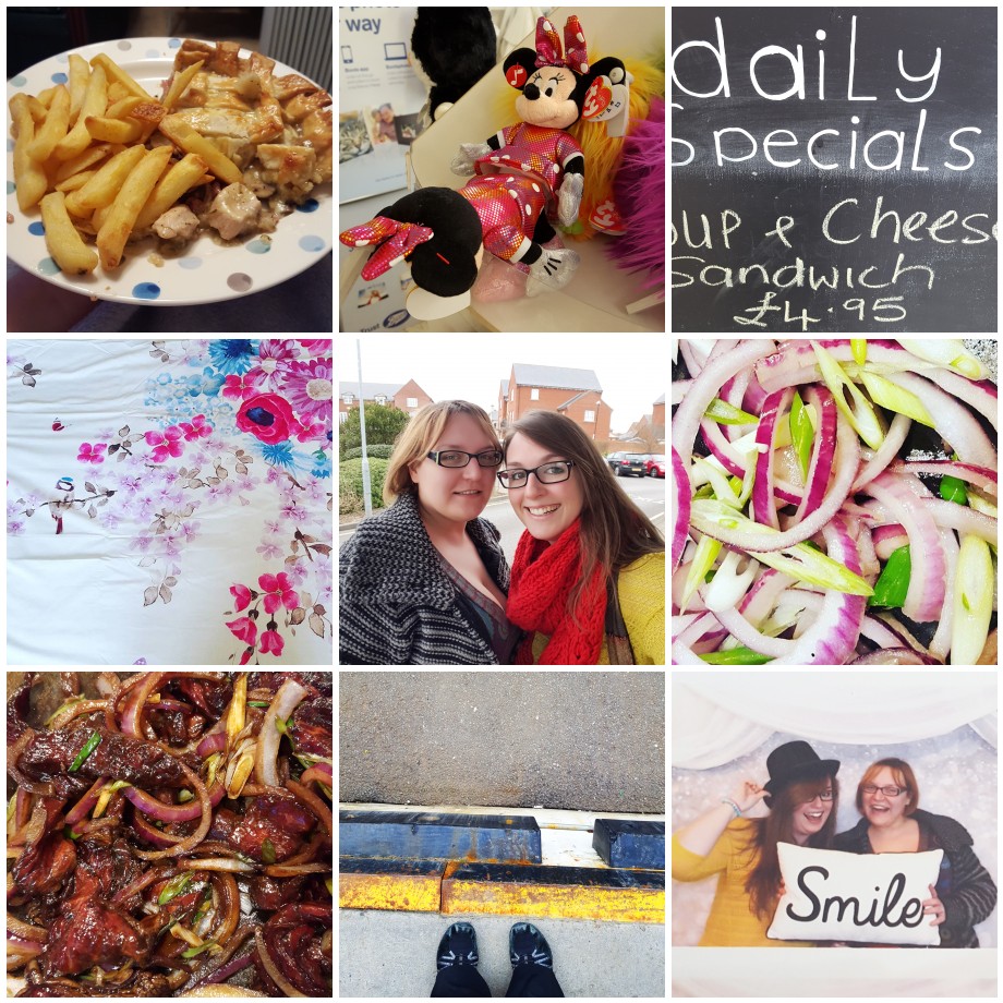 From left to right: an amazing chicken pie made by Dicky, putting cuddly toys in naughty positions to wind up the shop assistants in Boscombe, “soup and cheese sandwich” – is that even possible?, my lovely new springtime bedding, Kirsty and I on a very special outing!, cooking with purple and green, …and then adding sauce and spoiling the colours, standing on the edge, and another besties photo!