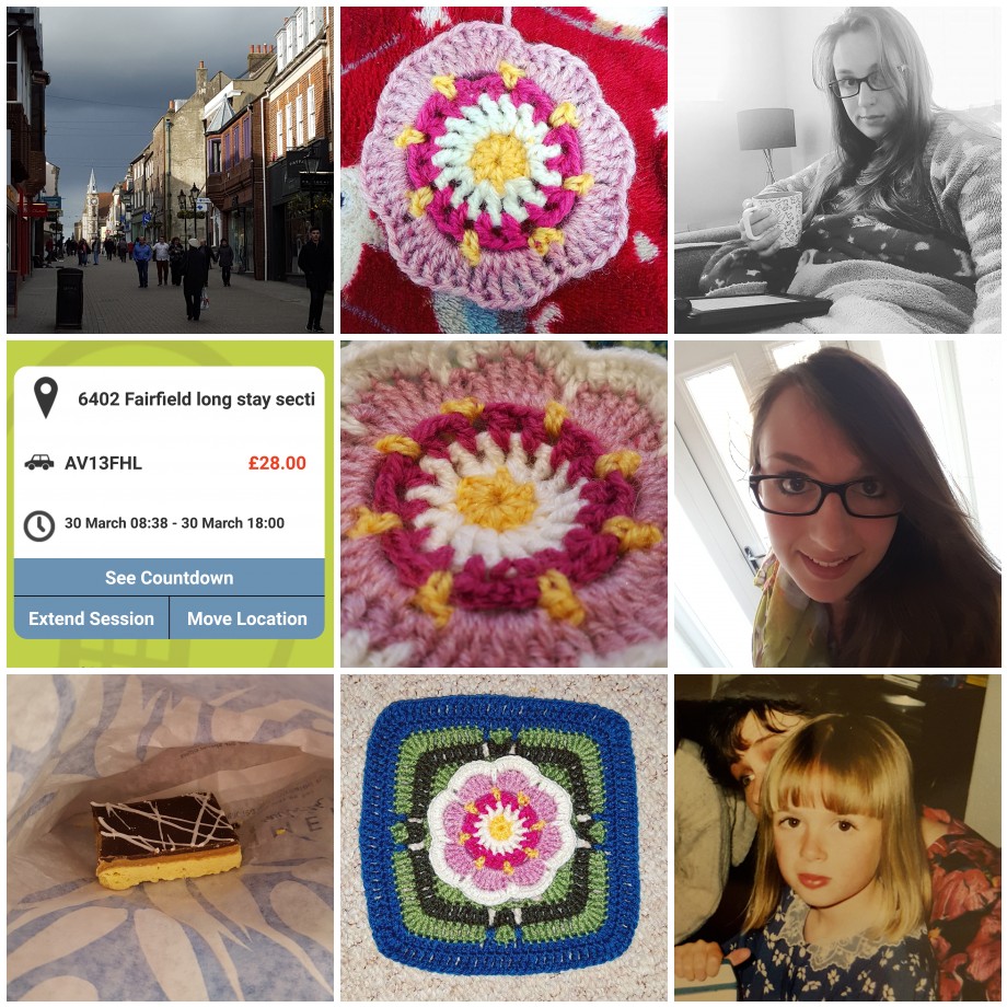 From left to right: a storm looming in Dorchester, starting my next motif, waking up early and enjoying some reading time, long stay parking on a Wednesday in Dorchester is an absolute rip off, details of the next flower, all ready for a day of sales, my brother brought me a piece of millionaires shortbread, the finished motif – 3 more to go, and spending time looking through old photo albums…oh god…