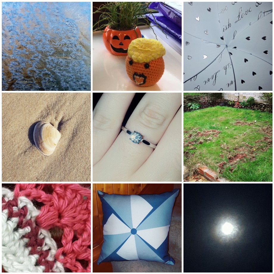 From left to right: icy mornings, Herbert the orange has made a transformation into Donald Trump, our invite to Kirsty’s wedding arrived, beachy walks, I got engaged!!, the badger dug up our lawn…, something new, my lovely cushion from Liz, and the super moon!