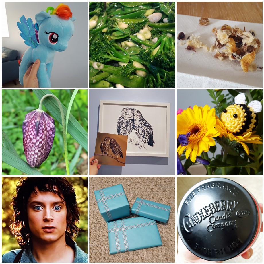 From left to right: the My Little Pony that I gave my brother for his birthday, green cooking, dissecting a hot cross bun (raisins are disgusting), my fritillary is still going strong, received a card identical to our lounge art, one of Mum’s bumblebees (for the wedding bunting), the start of an epic Lord Of The Rings (extended edition!!) marathon, Kelly’s birthday presents all wrapped and ready to go, and a lovely Candleberry candle from my colleague Kara!