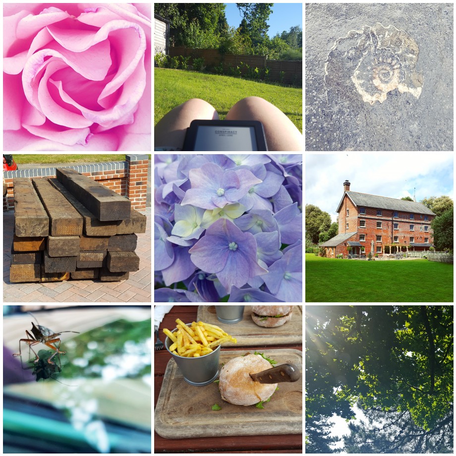 From left to right: our “High Hopes” rose in bloom, chilling in the garden with my Kindle, fossil hunting in Charmouth, a delivery of sleepers for our garden, pretty blue hydrangea flowers, a trip to Sopley Mill for wedding planning, a shield bug on Dave’s car, delicious lunch at a country pub, and sunlight through the trees!