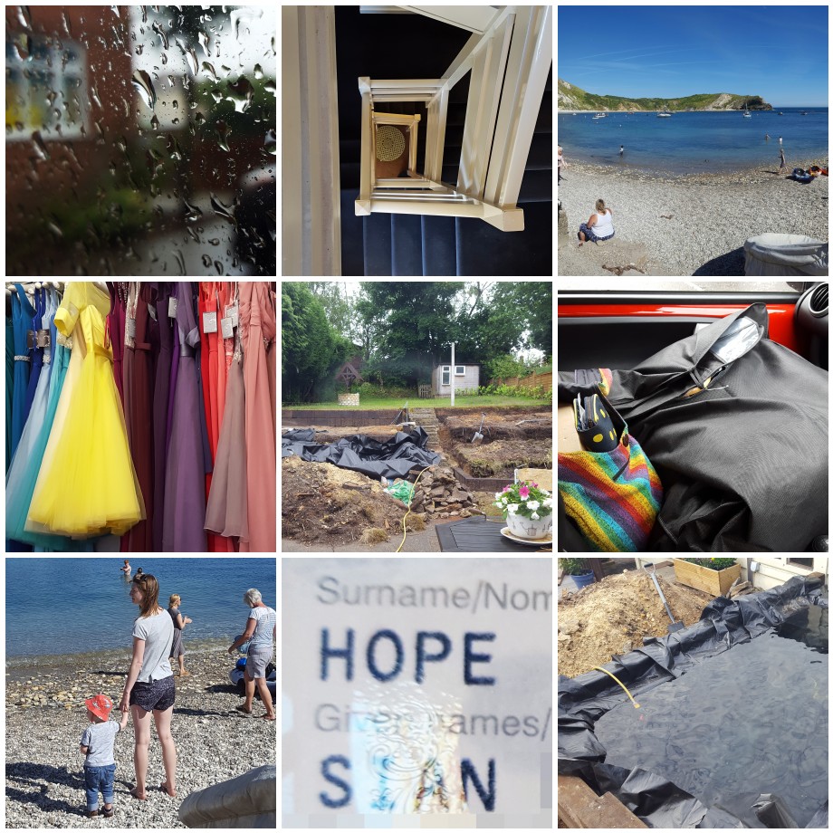 From left to right: rainy mornings, down some spiral stairs, Lulworth Cove, pretty bridesmaid dresses, work in the garden continues, going for my first dress fitting, beachy times with Sarah and Ruben, the first item in my new name!!, and filling the new pond.