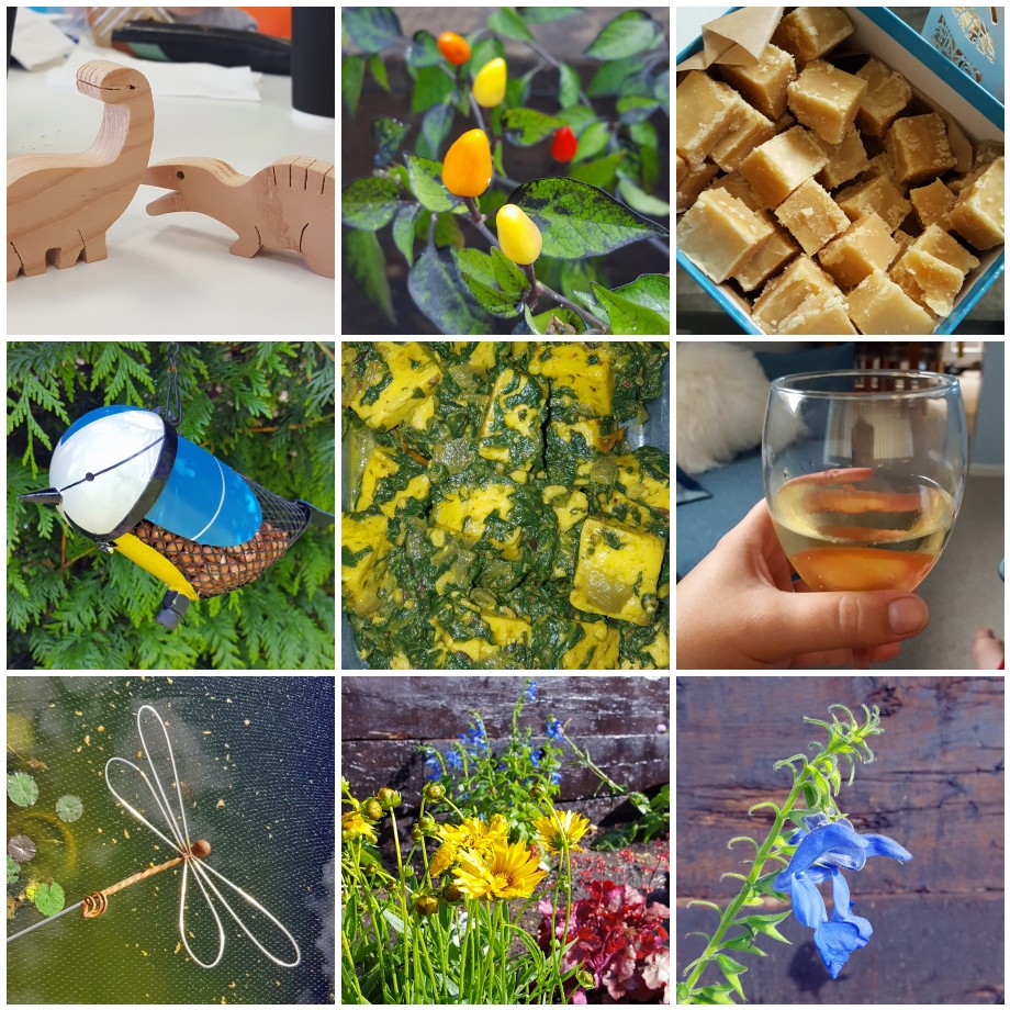 From left to right: wooden dinosaurs, our funky fairy light chillies, a box of tablet, peanuts in my bluetit feeder, amazing Palak Paneer, white wine needed, our new dragonfly, bee friendly garden plants, and beautiful blue salvia!