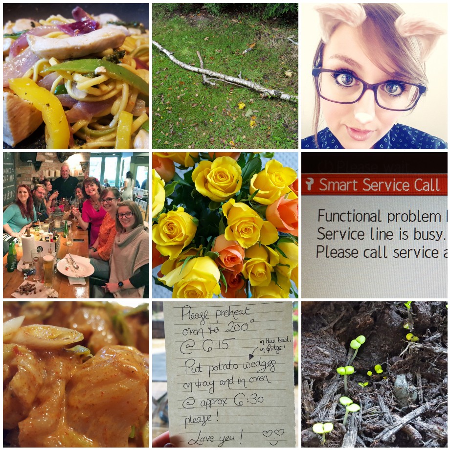 From left to right: noodles for dinner, a chunk fell off one of our neighbours trees, kitty Shaz, drinks with the lovely pharmacy gang, bought myself some roses, go to work to scan…scanner breaks, marinated chicken before work, dinner instructions for Dave!, and our little herbs!