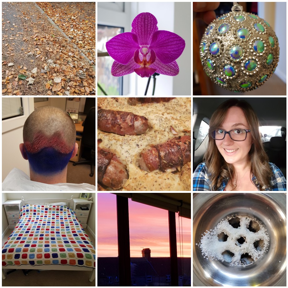 From left to right: Autumn leaves, our bathroom orchid is flowering again, bought some new baubles, dying my colleagues Movember hair moustache, toad in the hole, had my hair cut!, finally photographed Dave’s blanket (2 years later), sunsets at work, and adulting by cleaning our drains haha!