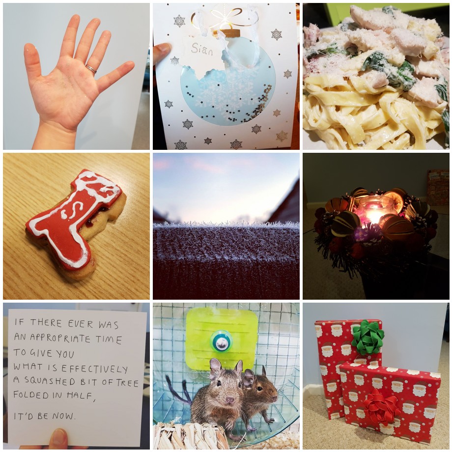 From left to right: hands covered in glitter, my Secret Santa gift (thank you to whoever bought it!), chicken and bacon pasta, a cute little cookie from Roxy, ice crystals in the morning, my lovely fruit wreath with a festive candle, my Christmas card from Dave, little degus in Pets at Home, and special presents for special boys!