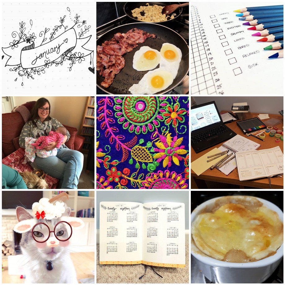 From left to right: one of my lovely bullet journal banners, cooked breakfast for New Years Day, mood tracking, meeting baby Olivia, my lovely new bag from Gurpriya, where the bullet journal magic is happening, putting silly filters on Alex, annual calendar, and pie for dinner!