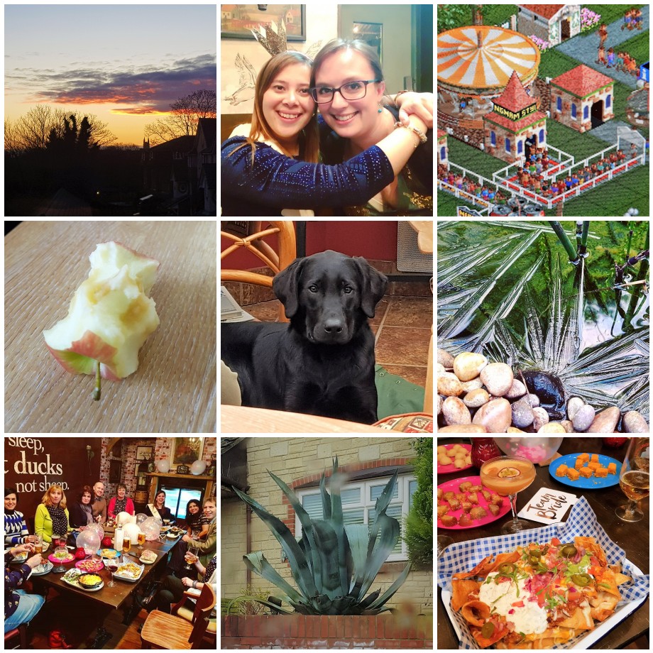 From left to right: sunrise before work, this amazing friend’s leaving/hen party, playing Rollercoaster Tycoon!, left my phone for 10mins and came back to random staffroom photos, meeting Toby for the first time, ice on the pond, party time, the giant aloe vera in my Grandparents’ street, and nachos and cocktails!