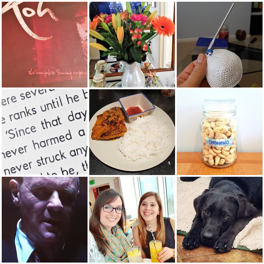 From left to right: Koh Thai with my brother for dinner!, Pat’s Mother’s Day flowers, a bit of evening crochet, finished my book, a new recipe – Burmese chicken and sweet chilli sauce (homemade!), sorting out cupboards and putting things in jars, watching Hannibal!, lovely lunch with lovely Gurpriya, and cute little Toby =)