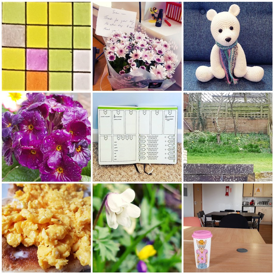 From left to right: my “year in pixels” tracker is coming along nicely, flowers from a patient at work (thank you), Marcio’s finished teddy, pretties in our front pots, an afternoon of journaling, the disappoint that the 200+ bulbs I planted didn’t do anything, amazing scrambled eggs, come on little flowers!, and a quiet start to a day at work!