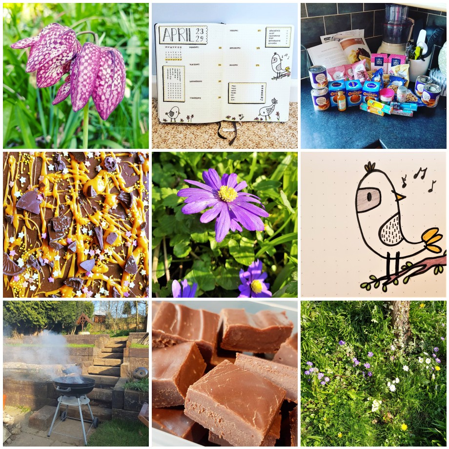 From left to right: my snakes head fritillary finally showed it’s face, lovely bird themed April spread, all of my fudge ingredients!, chocolate orange fudge before slicing, little purple anemone, doodle bird, our first BBQ of the year, finished coffee Bailey’s fudge, and our wild patch is looking much prettier now (finally!)