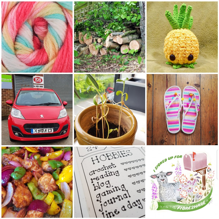 From left to right: swirly yumminess, Dave and his Dad made a lot den for hedgehogs and other wildlife in our garden, “Prolapse” the Pineapple, my little car passed her MOT, re-potted the sunflowers, pom pom flip flops!, cooking dinner, dotty lettering, and my first Fibreshare!